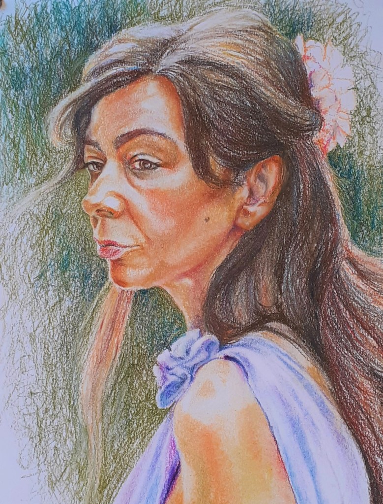 The picture was made from life in one sitting of approximately 4 hours, – then the background, dress and hair were finished off in the studio from a photograph.